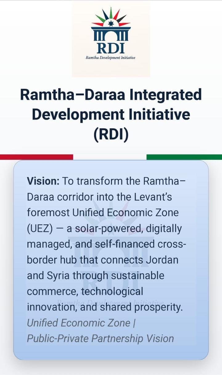 تُقدم هذه الرؤية، التي وُضعت ضمن إطار شراكة قوية بين القطاعين العام والخاص (PPP)، نموذجاً لتحول اقتصادي شامل، يرتكز على الاستدامة والتكنولوجيا المتقدمة والازدهار المشترك بين الأردن وسوريا.