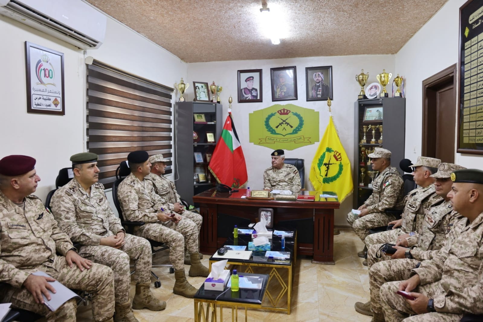 نشامى الإخباري- تفقد رئيس هيئة الأركان المشتركة، اللواء الركن يوسف أحمد الحنيطي، اليوم الأربعاء، واجهة كتيبة حرس الحدود/8 الملكية إحدى وحدات لواء حرس الحدود/3 التابع للمنطقة العسكرية الجنوبية، وكان في استقباله قائد المنطقة.