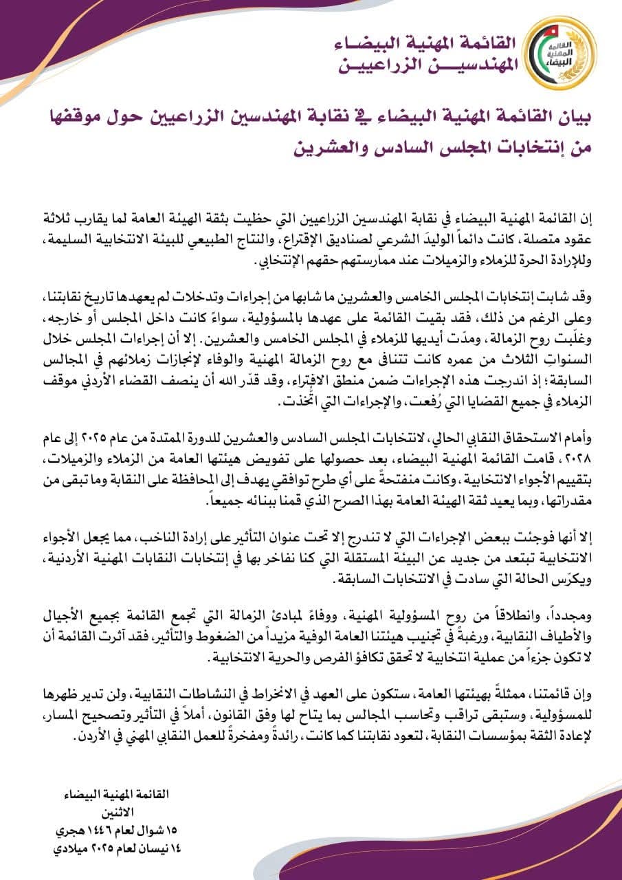 نشامى الإخباري – بيان القائمة المهنية البيضاء في نقابة المهندسين الزراعيين حول موقفها من إنتخابات المجلس السادس والعشرين
