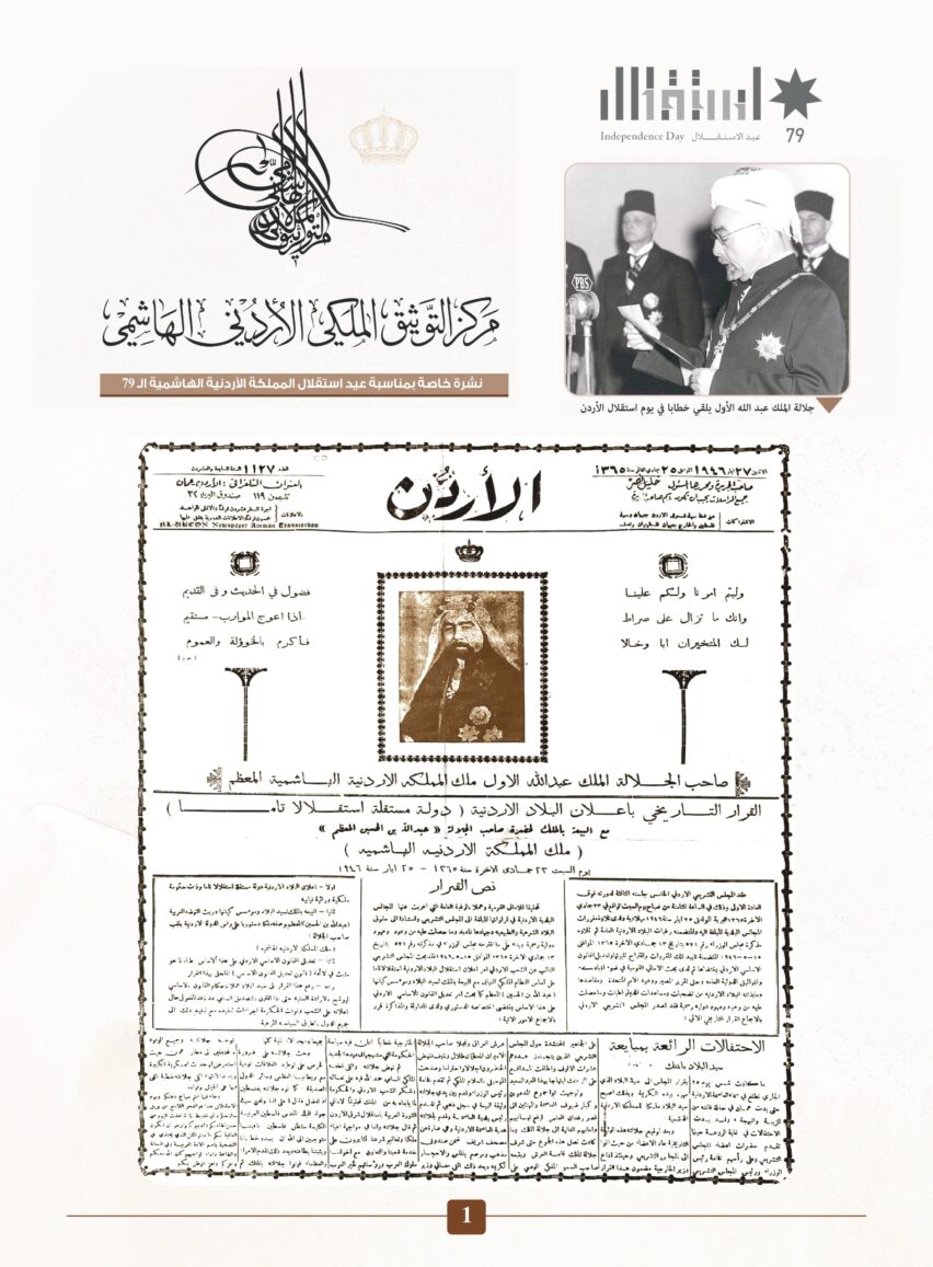 نشامى الاخباري _ أصدر مركز التوثيق الملكي الأردني الهاشمي بمناسبة الذكرى التاسعة والسبعين لاستقلال المملكة، نشرة توثيقية خاصة تستعرض أبرز المحطات والأحداث الوطنية التي رافقت هذا الحدث التاريخي الخالد.