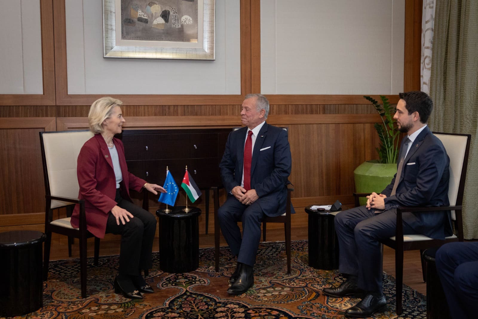 وقد شدد جلالته على أهمية العمل في سبيل تعزيز ضمان وصول المساعدات والاستجابة الانسانية في قطاع غزة ، بهدف الحد من التبعات الكارثية المأساوية للحرب على أهل غزة ، كما أكد جلالته أيضاً على ضرورة تهدئة الوضع في الضفة الغربية والقدس ، ودعم جهود السلطة الوطنية الفلسطينية بما يخدم الشعب الفلسطيني ويعمل على تحقيق تهدئة الاوضاع ، كما تطرق جلالته أيضاً خلال المباحثات واللقاءات التي اجراها الى مؤتمر حل الدولتين الذي عقد في نيويورك وبتنظيم مشترك من قبل فرنسا والسعودية ، وحث على ضرورة البناء على مخرجات هذا المؤتمر للاعتراف بالدولة الفلسطينية .