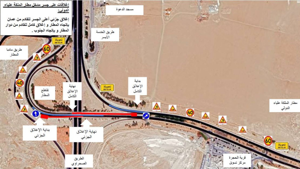 كما سيتم إغلاق كامل لحركة السير أعلى الجسر القادم من المطار باتجاه العقبة، كونه مسربًا واحدًا غير قابل للفصل. سيتم تحويل حركة السير باتجاه عمان، ثم الالتفاف من النفق قبل مسجد الفايز للعودة باتجاه العقبة، وذلك بالتزامن مع أعمال المسرب الأيسر باتجاه المطار.