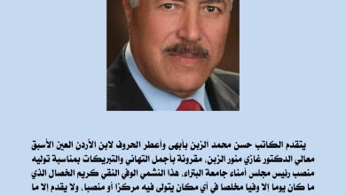 نشامى الإخباري_ يتقدم الكاتب حسن محمد الزبن بأبهى وأعطر الحروف لابن الأردن العين الأسبق معالي الدكتور غازي منور الزبن، مقرونة…