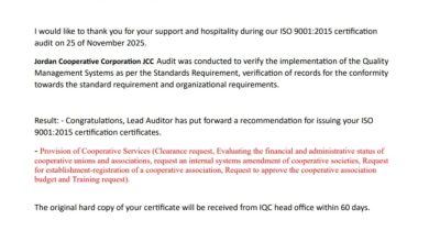 نشامى الاخباري _ حصلت المؤسسة التعاونية الأردنية على شهادة نظام إدارة الجودة ( ISO 9001:2015) من قبل منظمة (JASANZ)، وذلك…